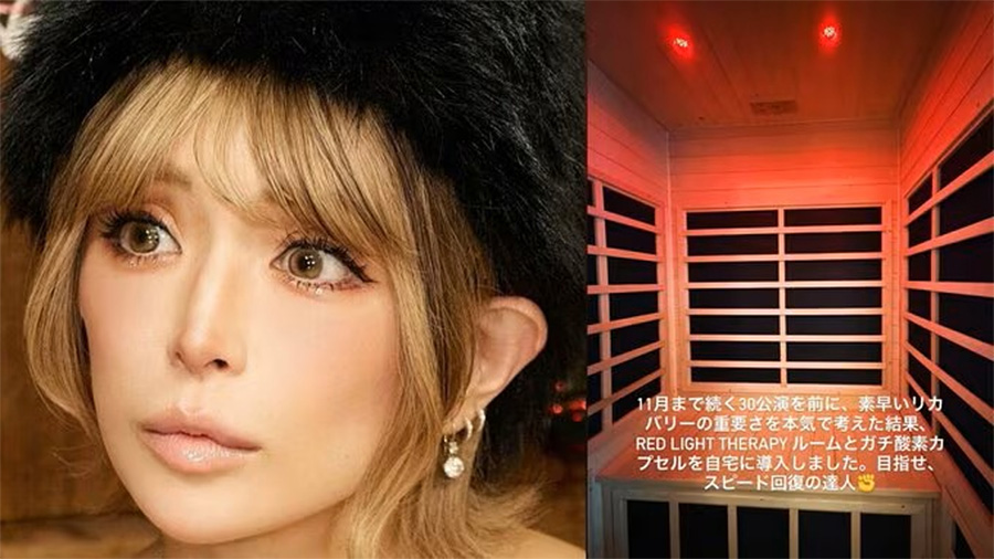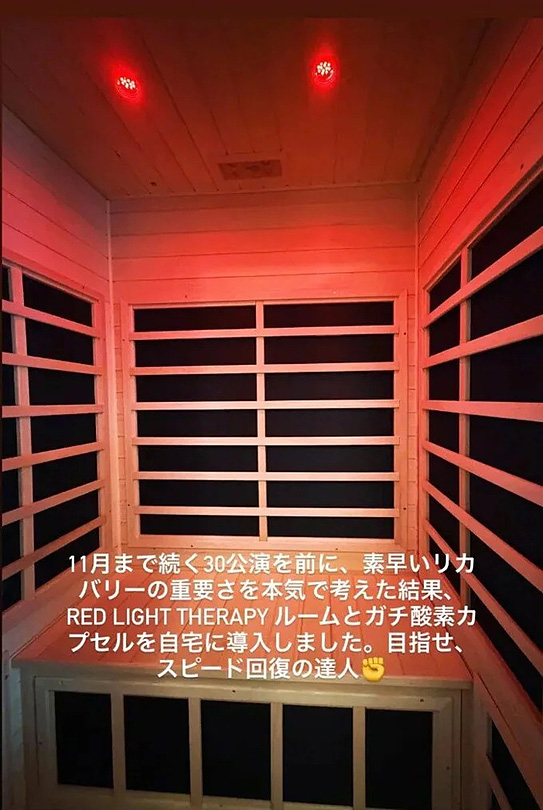 TBS NEWS DIGでは、現在開催中で11月まで続く全30公演の全国ツアーを完走するため、ご自宅にRED LIGHT THERAPYルームと酸素カプセルを導入したことをInstagramストーリーズで明かしたと報じられています。投稿内では、素早いリカバリーの重要さを本気で考えた結果、RED LIGHT THERAPYルームと酸素カプセルを自宅に導入したことが紹介され、公開写真には木材に囲まれた空間が赤色系のライトに包まれている様子も掲載されております。